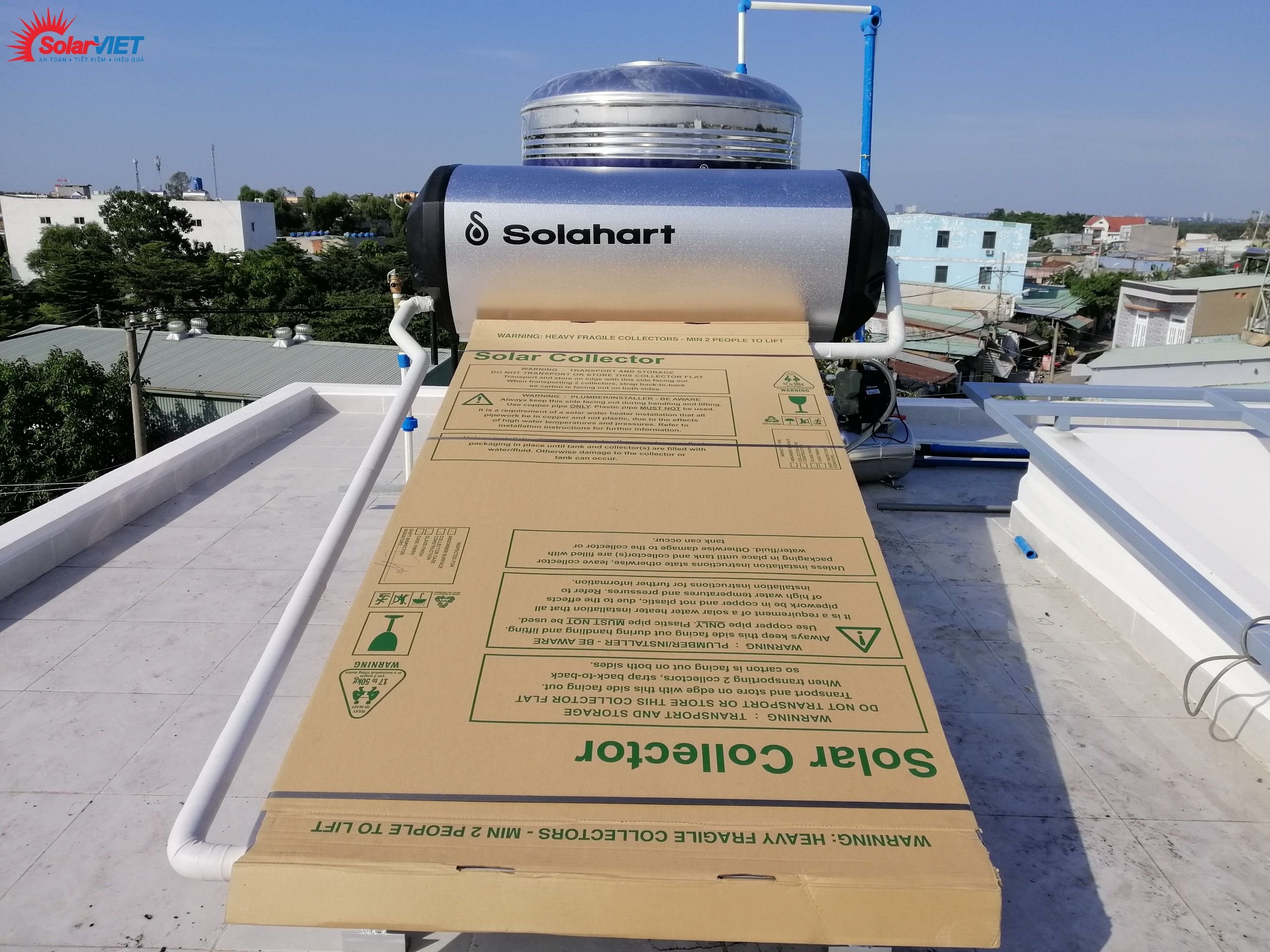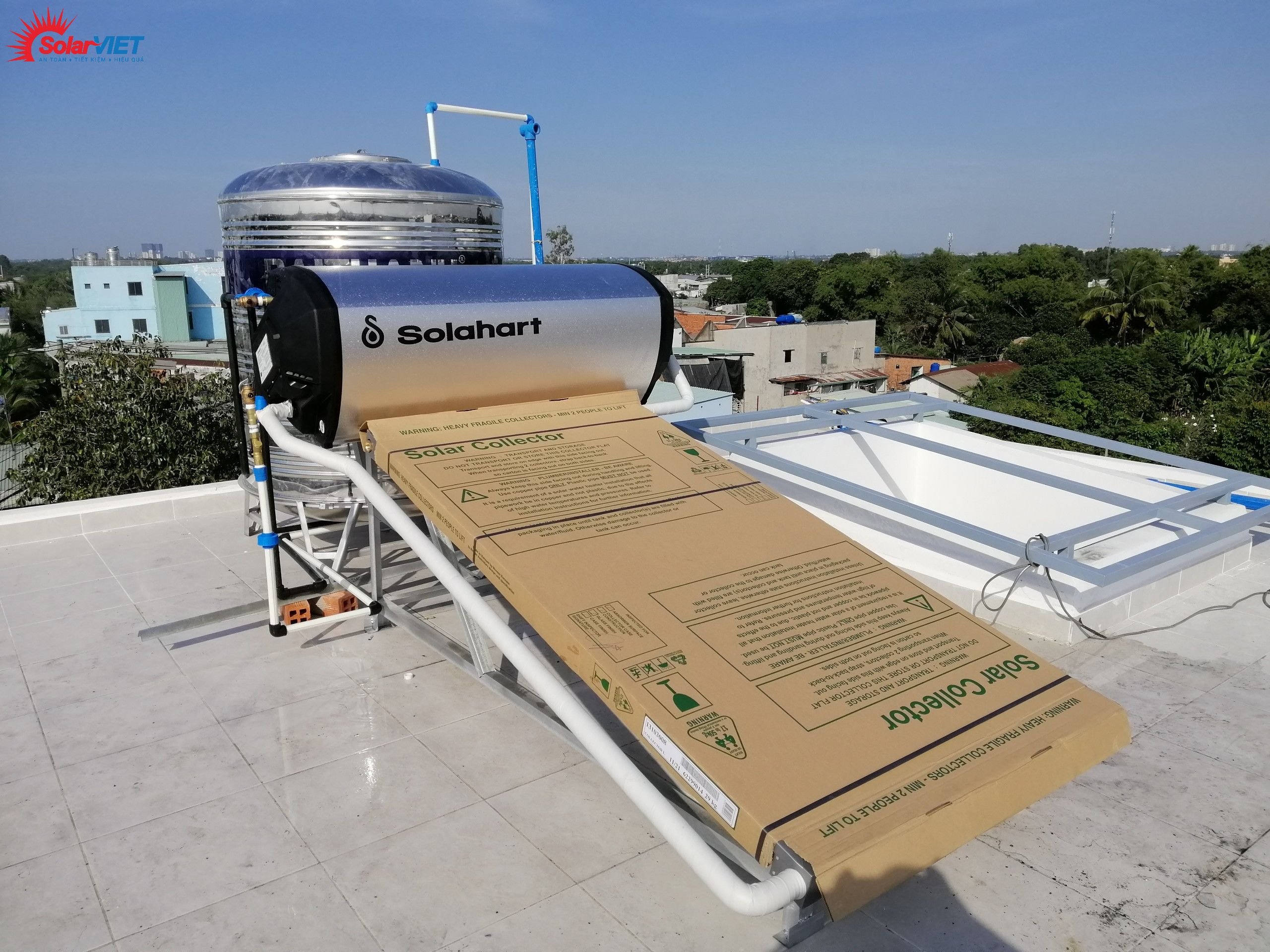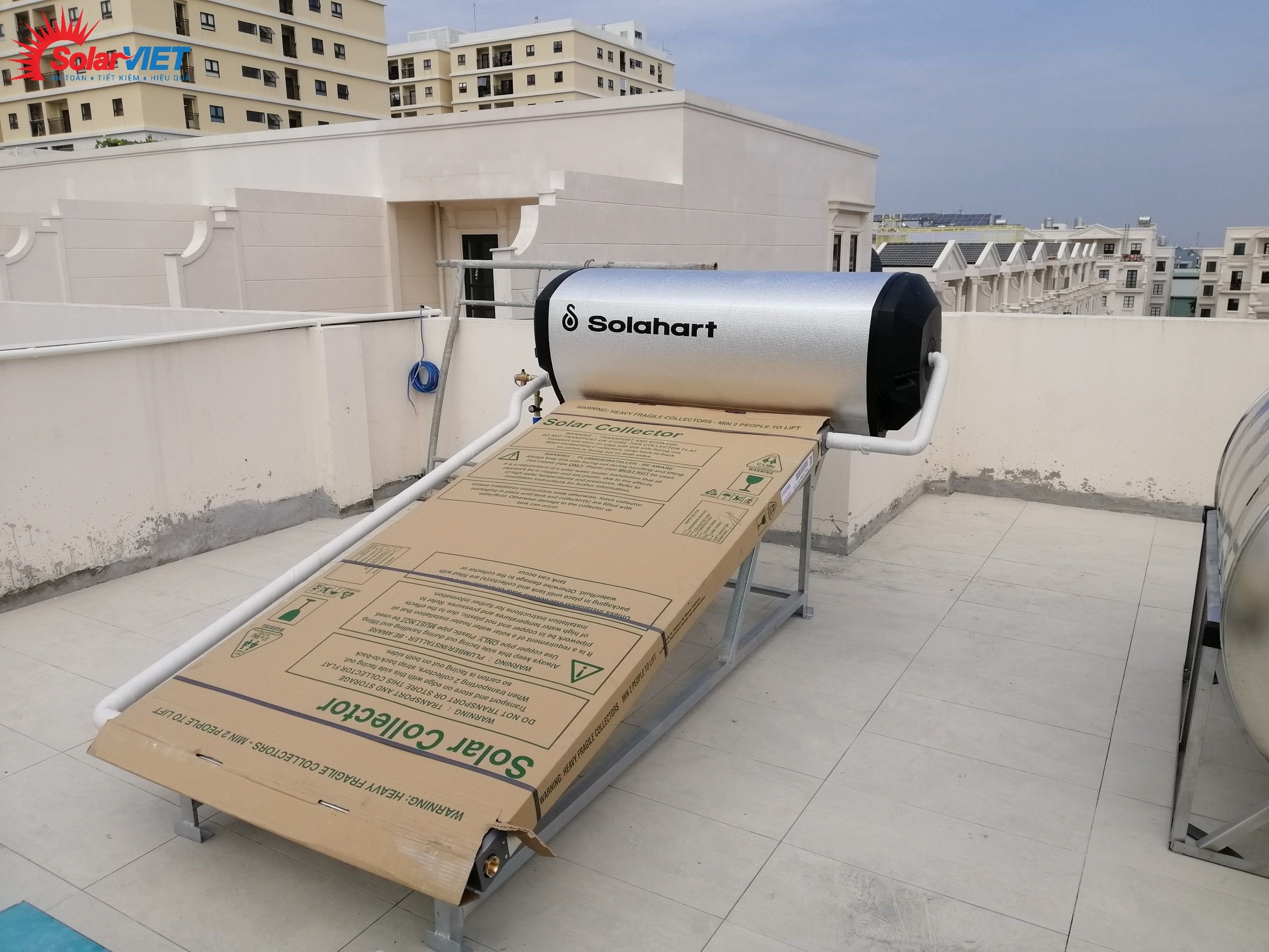 Solahart Premium 180L lắp trên mái bằng quận Gò Vấp, khách chưa sử dụng ngay nên máy được bao bọc cẩn thận, hạn chế va đập tại công trình.