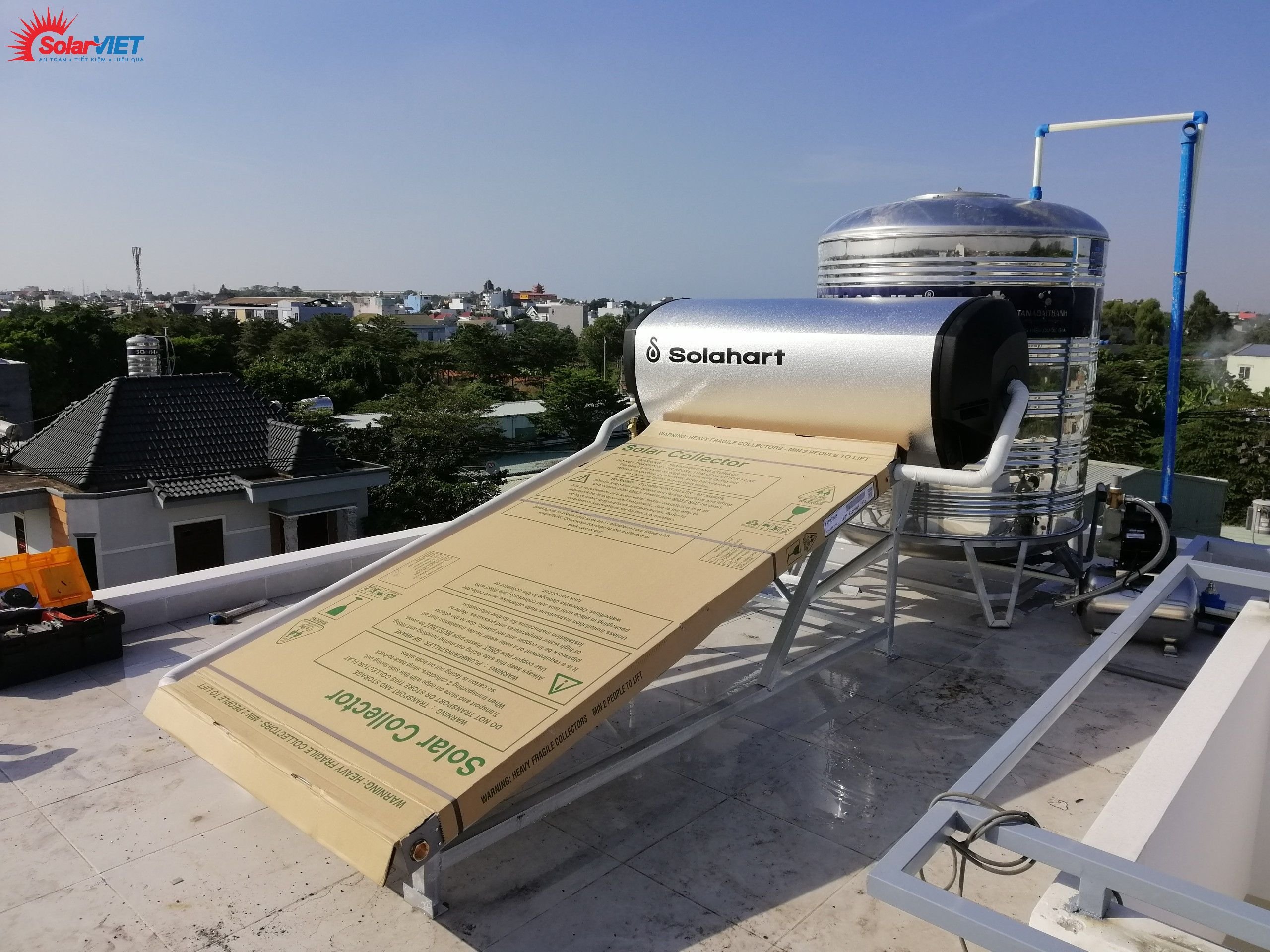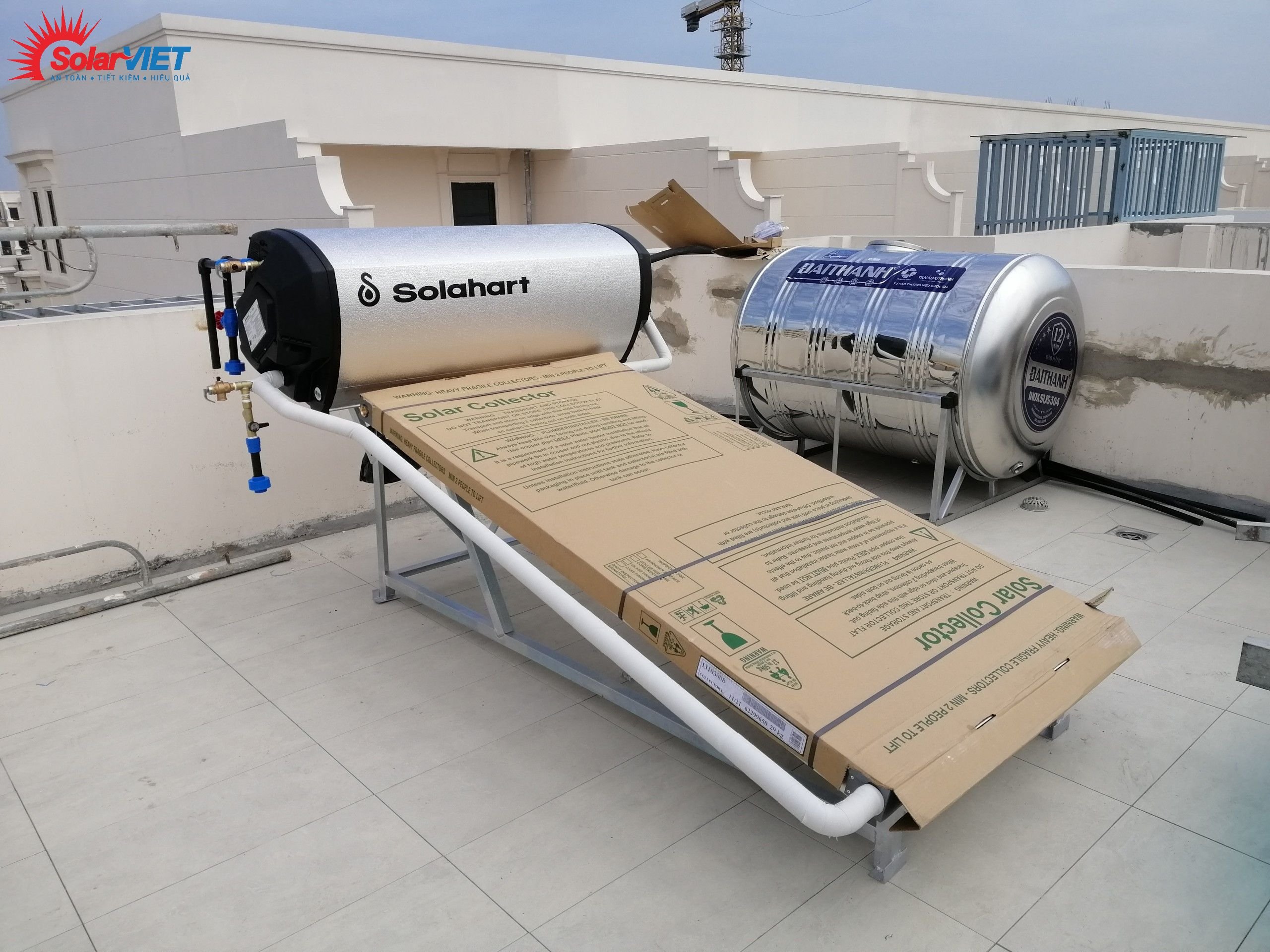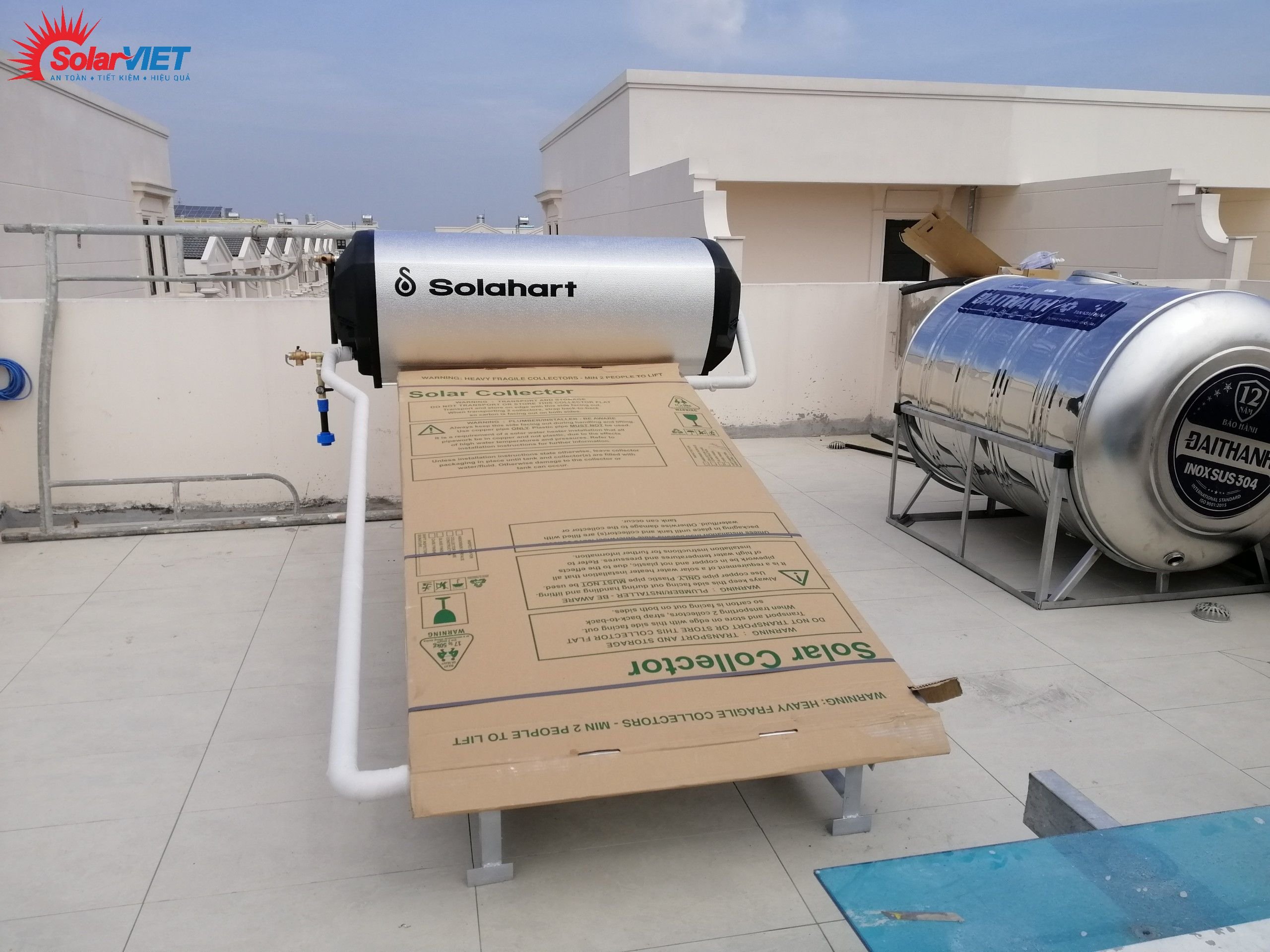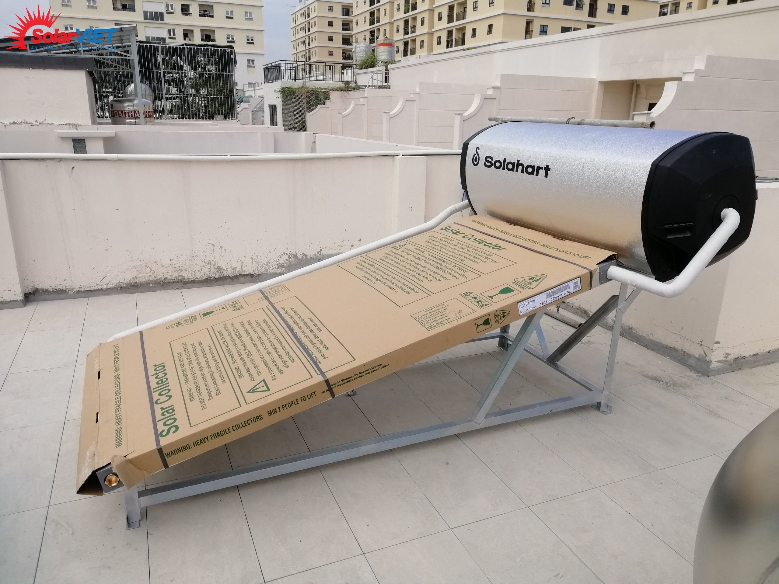 Solahart Premium 180L lắp trên mái bằng quận Gò Vấp, khách chưa sử dụng ngay nên máy được bao bọc cẩn thận, hạn chế va đập tại công trình.