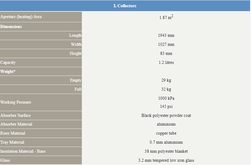 Solahart streamline 320L kiểu tách rời có sẵn các tấm thu nhiệt ‘L’ của Solahart để hấp thụ bức xạ mặt trời và truyền nhiệt vào nước. Tấm thu nhiệt L với bề mặt hấp thụ bằng nhôm sơn tĩnh điện màu đen cung cấp giải pháp tiết kiệm phù hợp ở các khu vực có lượng bức xạ năng lượng mặt trời từ thấp đến cao.