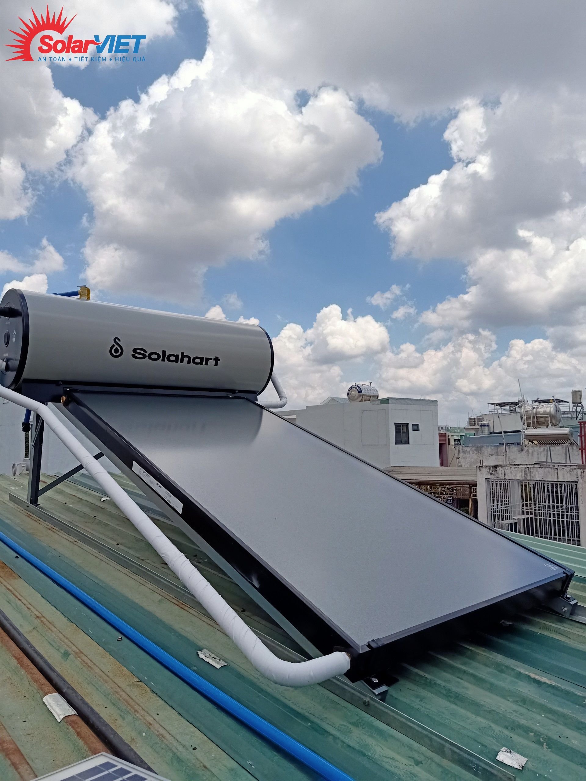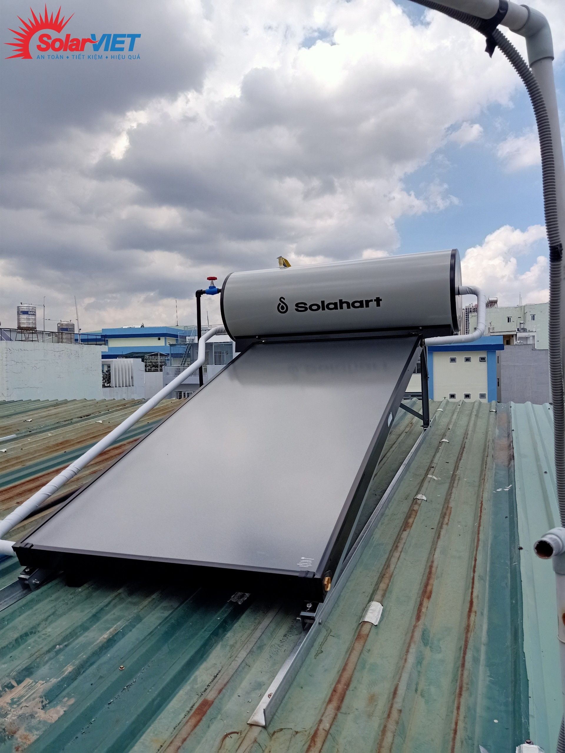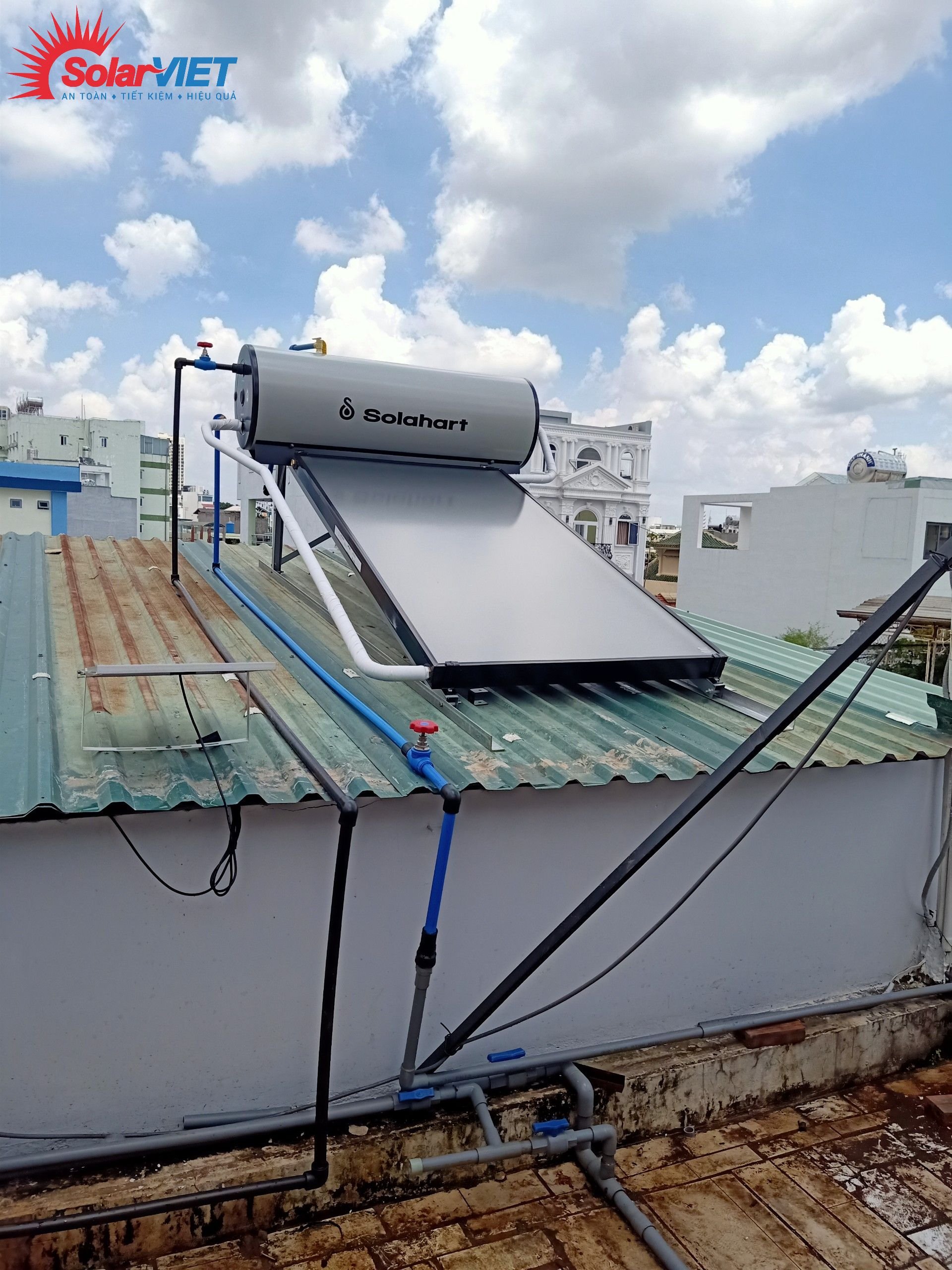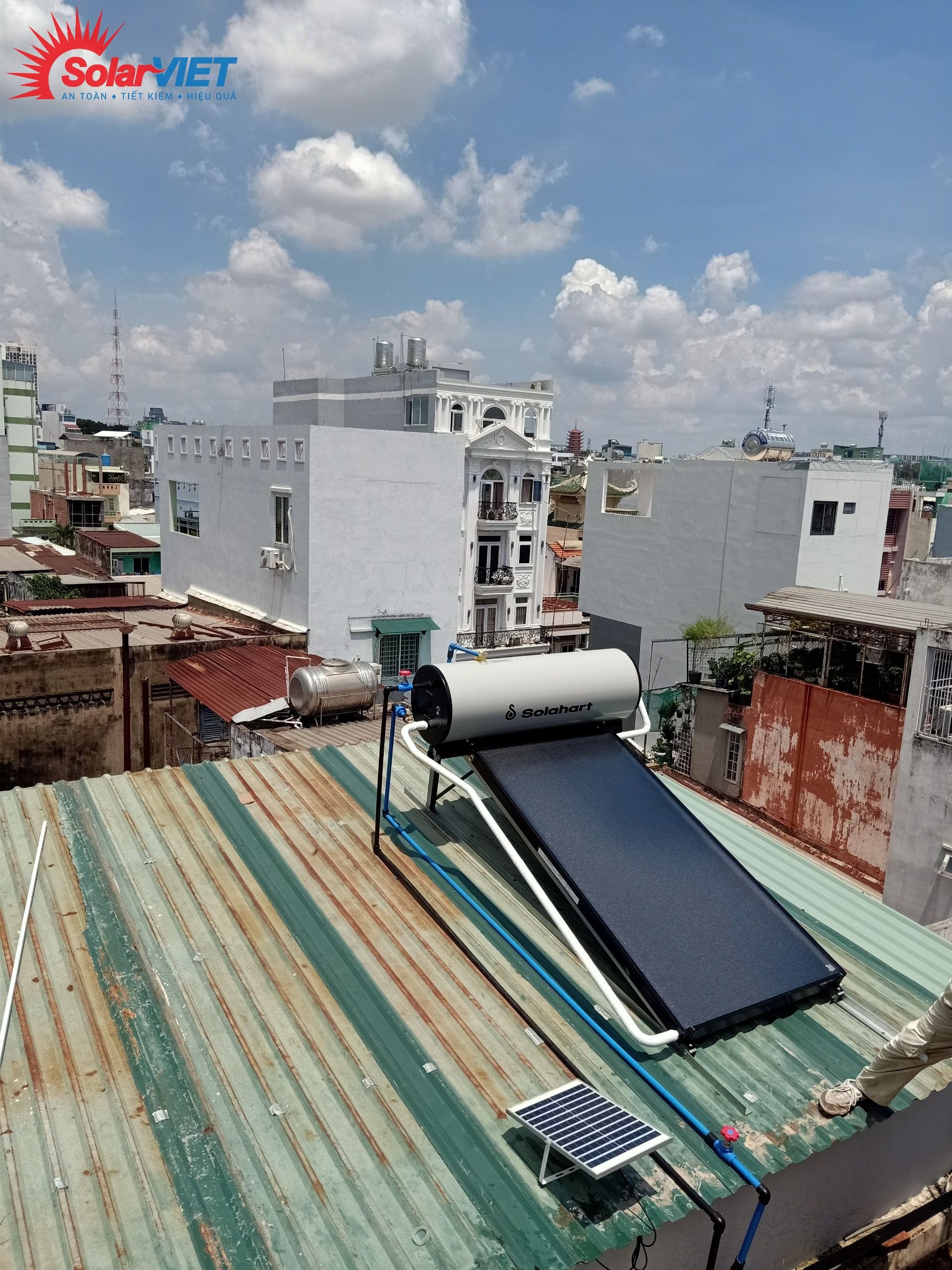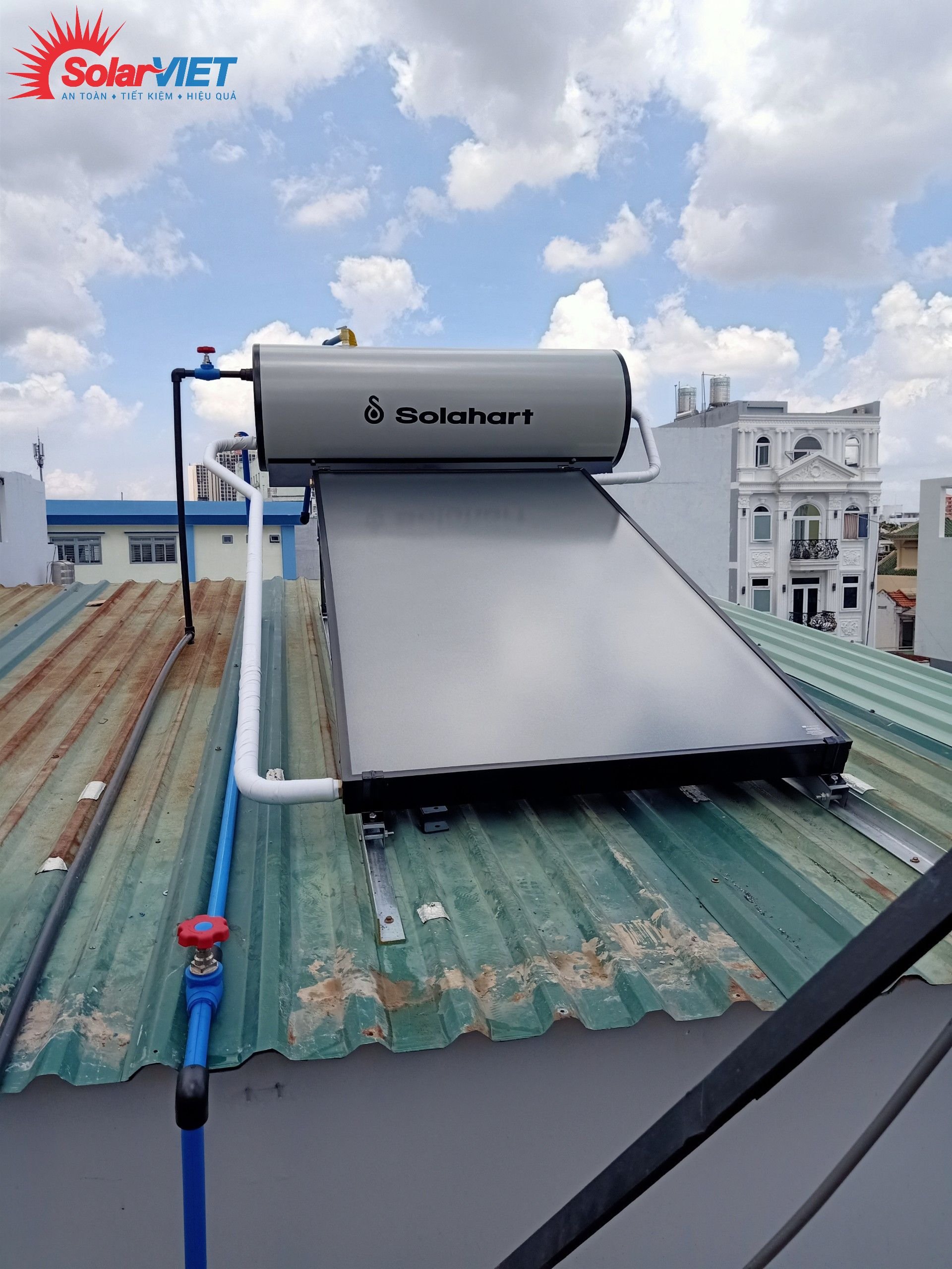 Solahart Sunheat 151L – máy nước nóng năng lượng mặt trời cao cấp của Úc được gia cố kê sắt trên mái tôn cho hộ gia đình khách hàng ở Quận 10.